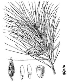 3.马尾松属乔木,高达45m,胸围1.5m。树皮红褐色,下部灰褐色,成不规则长块状裂。小枝常轮生,淡黄褐色,无白粉,无毛;冬芽卵状圆柱形,褐色,先端尖,芽鳞边缘丝状,先端尖或有长尖头。叶针形,2针一束,稀3针一束,长12-30cm,细长而柔软,叶缘有细锯齿,树脂道约4-8个,在背面边生,或腹面也有2个边生;叶鞘初呈褐色,后渐变成灰黑色,宿存。雄球花淡红褐色,圆柱形,弯垂,长1-1.5cm,聚生于新枝下部苞腋,穗状;雌球花单生或2-4个聚生于新枝顶端,淡紫红色。球果卵圆形或圆锥状卵形,长4-7cm,径2.5-4cm,有短梗,下垂,熟时栗褐色;中部种鳞近长圆状倒卵形,长约3cm;鳞盾菱形,微隆起或平,鳞脐微凹,无刺。种子长卵圆形,长4-6mm,连翅长2-2.7cm。花期4-5月,果熟期翌年10-12月。