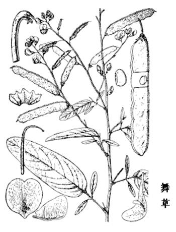 舞草是小灌木,高达1m。茎有纵沟,无毛。叶柄长1-2cm;单叶或三出复叶,顶生小叶较大,长圆形至披针形,长5.5-10cm,宽1-2.5cm,先端圆或钝,具短尖,下面有平贴的短柔毛,侧生小叶很小,长圆形或条形;叶柄长1-2cm;叶有自发性之运动,故名“舞草”。圆锥花序顶生,长达24cm,或为腋生总状花序;苞片阔卵形,长约6mm,脱落;花紫红色,长7.5mm;花萼长约1.5mm,萼齿短;龙骨瓣具爪;雄蕊10,二体。荚果镰形或直,长2.5-4cm,宽约5mm,疏生柔毛,腹缝线直,背缝线稍缢缩,成熟时沿背缝线开裂,有5-9个荚节。花期7-9月,果期8-10月。