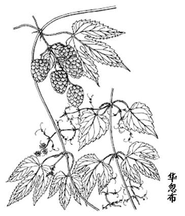 华忽布是多年生草质藤本,长4-6cm。全株被倒生短刺毛。单叶对生;叶柄长4-8cm,有钩刺;叶片轮廓卵圆状,3-5裂,稀7裂,着生花序枝上的叶不分裂,长、宽各5-13cm,先端尖,基部心形,上面粗糙,密被短刺毛,下面疏生腺点,脉上有粗毛,边缘有锯齿。花单性,雌雄异株;雄花序圆锥形,大型,长10-20cm;雄花小,花被片5,雄蕊5,淡黄色;雌花每2朵生于同一苞片的腋部,苞片覆瓦状排列,组成近圆形的短穗花序,着生于叶腋,稍下垂,具细长梗。果穗球形,宿存苞片内面基部有芳香腺点,于花后增大。瘦果扁圆形,被黄色腺点。花期8月,果期9-10月。