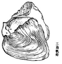 2.三角帆蚌的贝壳大而扁平,壳质坚硬,外形略呈三角形。左右两壳顶紧接在一起,后背缘长,并向上突起形成大的三角形帆状后翼,前背缘短小,呈尖角状。腹缘近直线,略呈弧形。壳面不平滑,壳顶部刻有粗大的肋脉。生长线同心环状排列,距离宽。贝壳内面平滑,珍珠层乳白色。