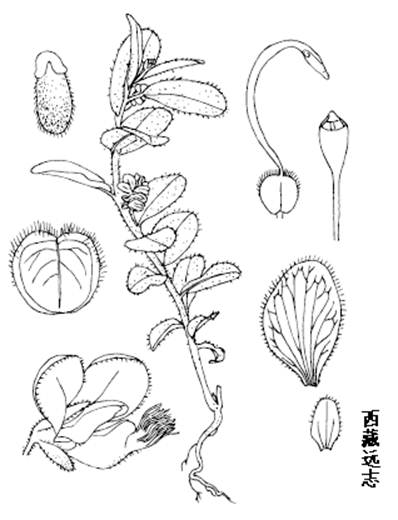 西藏远志是多年生草本,高6-20cm。根粗壮,肉质,深褐色;茎自基部多分枝,圆柱形,直立或铺散,密被卷曲短柔毛和刺毛状棉毛。单叶互生;叶柄极短;叶纸质,叶片椭圆形或倒卵状椭圆形,长1.5-4(-7.5)cm,宽0.7-2.5(-4)cm,先端钝,或微凹,基部钝至近圆形,全缘,具缘毛,上面绿色,下面淡绿色,两面均被刺毛状棉毛,主脉在上表面微凹,在背面隆起,侧脉3-5对。花两性,总状花序腋生或与叶对生,长1.2-2cm,具8-15朵花,被刺毛状棉毛;花长6-9mm,梗长约2mm,被长棉毛,基部具苞片3枚,卵形,长约2mm,宿存;萼片5,宿存,外面3枚小,里面2枚大,花瓣状,绿色,先端带红褐色,斜卵形,长6-7mm,基部具短爪;花瓣3,分离,紫红色或白色具紫色条纹,侧生花瓣长4-5mm,基部内侧被柔毛,中部里面两侧各具1簇白色柔毛,具缘毛,龙骨瓣长5-7mm,盔形,基部耳状,具缘毛,顶端背部具细丝状鸡冠状附属物;雄蕊8,花丝长5-6mm,4/5以下合生成鞘并与花瓣贴生,具缘毛,花药黄色,卵形,顶孔开裂;子房近圆形,直径2mm,具翅,具缘毛,尤以顶部为甚,花柱弧曲,柱头2。蒴果圆形,直径3.5mm,具狭翅,并有缘毛。种子黑色,长圆形,直径1.5mm,密被白色柔毛,具1盔形微裂种阜。花、果期7-8月。