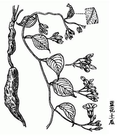 蓝花土瓜是多年生缠绕草本。具纺锤状块根,含淀粉。茎细长,圆柱形,有细棱,密被柔毛。单叶互生;叶柄长0.4-2cm,密被柔毛;叶片菱形或菱状卵形,长3-4.5cm,宽1.5-3cm,先端骤尖或锐尖,具小尖头,基部楔形,全缘,两面密被黄褐色绢毛;侧脉7-9对,近平行而不弧曲。聚伞花序腋生,着生1-3朵花,或因花序梗二歧分枝而具多花;苞片及小苞片鳞片状;萼片5,不等长,外方2片倒卵状长圆形,长0.8-1.2cm,先端具短尖头,内萼片倒卵形或椭圆形,长1.3-1.4cm,先端钝圆;花冠淡蓝色,狭钟状,长3.5-4cm,冠檐短三角形,疏被黄褐色缘毛;雄蕊5,不等长,花丝基部扩大,被毛;子房无毛,2室,花柱纤细,柱头2球形。蒴果长圆形,4瓣裂。种子黑色,无毛。 |