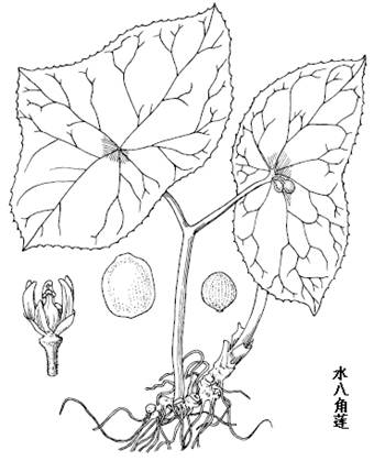 水八角莲是多年生草本。茎直立,细弱,无毛,基部有黄棕色薄纸质的鳞叶包被。根茎横走,细小,节间有近圆形的碗状小凹,生多数侧根,表面黄棕色,被白色或淡黄色毛。叶互生,薄纸质;叶柄着生于叶片的中部,长5-10cm;叶片通常2,稀3,叶不等大,形状多种,常呈偏心形,长5-11cm,宽8-18cm,先端为宽楔形,基部多为圆形,上面有时带紫红色,下面绿色或灰绿色,边缘不裂或有时具不明显的4-8浅裂,有稀疏的腺状锯齿。伞形花序有花2-5朵,生于离叶不远的叶柄近顶处,花梗长不及2cm,下弯,有长柔毛;萼片早落;花瓣6,深红色,线状长圆形;雄蕊6,长约7mm,内弯,药隔先端延长成细尖。子房上位,一室。浆果小,球形。种子多数。花期4-6月,果期6-9月。