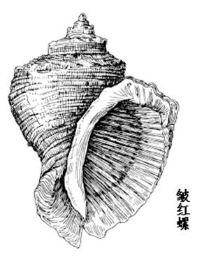 2、皱红螺形状与脉红螺相似,它的贝壳略近梨形,质坚厚,一般壳高77-97mm,宽58-74mm,螺层约7层,缝合线浅,在缝合线下方常形成强的皱褶。体螺层极膨大,尤其是体螺层的肩角上部具有显着的薄片状褶叠。在肩角下部有2-3条带有片状结节的螺肋,壳表黄褐色,或具红褐色斑点。壳口大,卵圆形。周围白色或杏红色。厣角质,红褐色。其他形状近似前种。