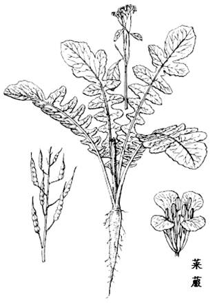 化合物成分:芥子碱(sinapine),芥酸(erucic acid)及亚油酸(linoleic acid),亚麻酸(linolenic acid),菜子甾醇(brassicasterol)和22-去氢菜油甾醇(22-dehydrocampesterol)和莱菔素(raphanin)等。
