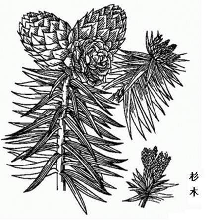 杉木属常绿乔木,高达30m,胸围达2.5-3m。幼树树冠尖塔形,大树树冠圆锥形。树皮灰褐色,裂成长条片脱落。大枝平展,小枝近对生或轮生。叶在主枝上辐射伸展,在侧枝上排成二列状,条状披针形,革质,微弯,坚硬,长2-6cm,边缘有细齿,上面中脉两侧有窄气孔带、下面沿中脉两侧各有1条白粉气孔带。雌雄同株;雄球花圆锥状,簇生枝顶;雌球花单生或2-4个集生枝顶,卵圆形,苞鳞与珠鳞结合而生,珠鳞先端3裂,腹面具3胚珠。球果近球形或卵圆形,长2.5-5m,径3-4cm,苞鳞三角状宽卵形,宿存。种子长卵形,扁平,长6-8mm,宽约5mm,暗褐色,两侧有窄翅。花期4月,球果10月下旬成熟。