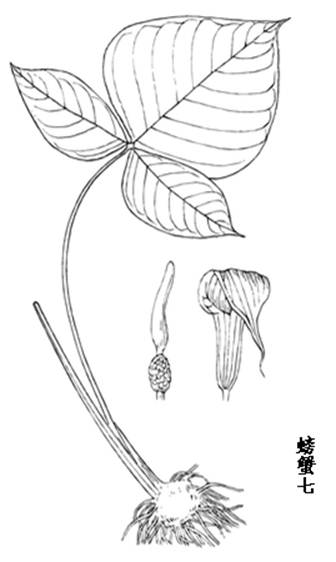 螃蟹七属多年生草本。块茎扁球形,直径3-5cm,常具多数小球茎。鳞叶3,褐色,宽2-2.5cm,向上渐狭,最上的长约15cm。叶柄长20-40cm,粗6-7mm,下部1/4具鞘;叶片3深裂至3全裂,裂片全缘,中裂片近菱形,卵状长圆形至卵形,长17-32cm,宽15-25cm;侧裂片斜椭圆形,长9-23cm,宽6-16cm;中肋背面隆起,侧脉9-10对,集合脉距边缘约5mm。花序柄比叶柄短而细,长18-26cm。佛焰苞紫色,有苍白色线状条纹,管部近圆柱形,长4-8cm,直径1.5-2cm,喉部边缘耳状反卷;檐部长圆三角形,拱形下弯或近直立,长6-12cm,宽4-4.5cm,长渐尖,具长1-4cm的尾尖。肉穗花序单性,雄花序长2.5-3cm,圆柱形,粗4-5mm,雄花有花药2-4,药室卵圆形,基部叉开,顶孔开裂;雌花序长约2cm,子房具棱,顶部常圆形,花柱枝极短而粗,柱头有毛;附属器粗壮,圆锥状,长约4.5-9cm,基部骤狭成短柄,上部长渐尖,先端钝,粗1.5-5mm,近直立或上部略弯。花期5-6月。