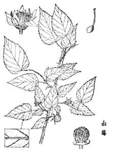山莓属落叶灌木,高1-3m。小枝红褐色,幼时有柔毛及少数腺毛,并有皮刺。单叶;叶柄长5-20mm;托叶条形,贴生于叶柄上;叶片卵形或卵状披针形,长3-12cm,宽2-5cm,不裂或3浅裂,有不整齐重锯齿,上面脉上稍有柔毛,下面及叶柄有灰色绒毛,脉上散生钩状皮刺。花单生或数朵聚生短枝上;花白色,直径约3cm;萼裂片卵状披针形,密生灰白色柔毛。聚合果球形,直径10-12mm,红色。花期2-5月,果期4-6月。 |