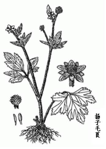 扬子毛茛 多年生草本,高20-50cm。须根多数,簇生。茎铺散,斜升,下部节上伏地生根长叶,多分枝,密生开展的白色或淡黄色柔毛。基生叶为三出复叶,叶柄长2-5cm,密生开展的柔毛,基部扩大成褐色膜质宽鞘抱茎;叶片轮廓圆肾形至宽卵形,长2-5cm,宽3-6cm,基部心形;中央小叶宽卵形或菱状卵形,3浅裂或深裂,边缘有锯齿,小叶柄长1-5mm,被开展的柔毛;侧生小叶不等2裂,较小,具短柄;小叶两面疏生柔毛。花两性,直径1.2-1.8cm,与叶对生,花梗长3-8cm,密生柔毛;萼片5,狭卵形,长4-6mm,宽2-3mm,外面有柔毛;花瓣5,狭卵形或近椭圆形,长6-10mm,宽3-5mm,黄色,基部有长爪,蜜槽小鳞片位于爪基部;雄蕊20余,花药长约2mm;花托粗短,密生白柔毛;心皮多数。瘦果扁平,长3-4mm,无毛,边缘有宽约0.4mm的宽棱,喙长约1mm。花果期5-10月。