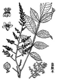 盐肤木是落叶小乔木或灌木,高2-10m。小枝棕褐色,被锈色柔毛,具圆形小皮孔。奇数羽状复叶互生,叶轴及柄常有翅;小叶5-13,小叶无柄;小叶纸质,多形,常为卵形或椭圆状卵形或长圆形,长6-12cm,宽3-7cm。先端急尖,基部圆形,边缘具粗锯齿或圆锯,叶面暗绿色,叶背粉绿色,被白粉,叶面沿中脉疏被柔毛或近无毛,叶背被锈色柔毛。圆锥花序宽大,顶生,多分枝,雄花序长30-40cm,雌花序较短,密被锈色柔毛;花小,杂性,黄白色;雄花花萼裂片卵形,长约1mm,花瓣倒卵形状长圆形,长约2mm,开花时外卷,雄蕊伸出,花丝线形,花药卵形;雌花花萼裂片较短,长约0.6mm,花瓣椭圆状卵形,长约1.6mm;花盘无毛;子房卵形,长约1mm,密被白色微柔毛;花柱3,柱头头状。核果球形,略压扁,径约4-5mm,被具节柔毛和腺毛,成熟时红色,果核径3-4mm。花期8-9月,果期10月。 |