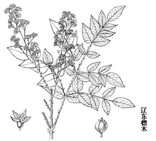 辽东楤木 灌木或小乔木,高1.5-6m。小枝疏生多数细刺,刺长1-3mm,基部膨大;幼枝上常有细长直刺,长达1.5cm。叶为二至三回羽状复叶,长40-80cm;叶柄长20-40cm;托叶和叶柄基部合生,分离部分线形,长约3mm,边缘有毛;羽片有小叶7-11,基部有1对小叶,叶片卵形至卵状椭圆形,长5-15cm,宽2.5-8cm,先端渐尖,基部圆形至心形,稀楔形,上面绿色,下面灰绿色。伞形花序聚生为顶生圆锥花序,长30-45cm,主轴短,长2-5cm;伞形花序直径1-1.5cm;总花梗长0.8-4cm,花梗长约7mm,均密生短柔毛;苞片和小苞片披针形,膜质;花黄白色;萼无毛,长约1.5mm,先端5齿裂,裂片卵状三角形;花瓣与萼等长,卵状三角形,花时反曲;雄蕊5;子房下位,5室,花柱5,离生或基部合生。核果圆球形,浆果状,黑色,直径4mm,有5棱。花期6-8月,果期9-10月。 |