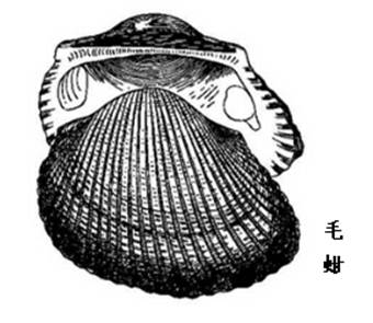 3、毛蚶的贝壳呈长卵圆形,质坚厚,壳长54mm左右,高46mm左右,两壳极膨胀,宽为高的3/4-4/5,右壳比左壳稍小,背侧两端略有棱角,壳顶稍偏前方,两壳顶间的距离中等。壳表放射肋30-35条,肋凸较密,呈方形小结节,左壳上较明显。壳表面被有棕褐色绒毛状壳皮,外皮常易磨损脱落,使壳面常有白色。壳内面白色或灰黄色,边缘具有与壳面放射肋相应的齿和沟。铰合部直,铰合齿约50个,中间小而密;两侧大而疏。前闭壳肌痕小略呈马蹄形,后闭壳肌痕为卵圆形。 |