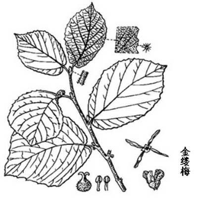 金缕梅属落叶灌木或小乔木,高达8m;小枝幼时有星状毛。叶互生;叶柄长6-10mm,被绒毛;托叶早落;叶片纸质,宽倒卵圆形,长6-12cm,宽3-7.5cm,先端短急尖,基部心形不等,边缘有波状齿,上面淡绿色,有短毛,下面密生灰色星状绒毛,侧脉7-9对。短穗状花序腋生,具数朵花;花两性;萼简短,萼齿4,宿存,被星状毛;花瓣4,黄白色,带状,长约1.5cm;雄蕊4,与退化雄蕊互生;子房近上位,2室,花柱2,长1-1.5mm,分离。蒴果卵圆形,长1.2cm,宽1cm,密被黄褐色星状毛。种子椭圆形,长约8mm,黑色,发亮。花期5月,果熟期10月。 |