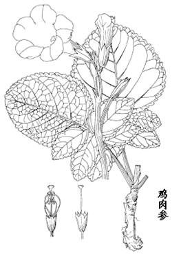 1.鸡肉参属多年生草本,高30-40cm。根粗壮、肥厚。无茎。叶基生,为一回羽状复叶;侧生小叶2-3对,卵形,顶生小叶较侧生小叶大2-3倍,阔卵圆形,先端钝,基部微心形,长达11cm,宽达9cm,边缘具钝齿,侧生小叶近无柄。总状花序有2-4朵花,着生花序近顶端;花葶长达22cm;花梗长1-3cm;小苞片2,线形,长约1cm;花萼钟状,长约2.5cm,萼齿三角形,先端渐尖;花冠紫红色或粉红色,长7-10cm,直径5-7cm,花冠筒长5-6cm,下部带黄色,花冠裂片圆形;雄蕊4,二强;子房2室,花柱长5.5-6.5cm,柱头扇形,薄膜质,2片裂。蒴果圆锥形,长6-8cm,具不明显的棱纹。种子多数,阔倒卵形,长约4mm,宽约6mm,膜质,淡褐色,边缘具薄膜质的翅,腹面具微小的鳞片。花期5-7月,果期9-11月。