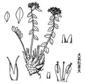 大花红景天属多年生草本。地上的根颈短,有少数花枝茎残存,黑色,高5-20cm。不育枝直立,高5-17cm,先端密生叶,叶片宽倒卵圆形,长1-3cm;花茎多数,直立或呈扇状排列,高5-20cm,呈稻秆色至红色。叶具短的假柄,叶片椭圆状长圆形或近圆形,长1.2-3cm,宽1-2.2cm,全缘、波状或具圆齿。伞房状花序,多花,有苞片;花大型,有长梗,雌雄异株;雄花萼片5,狭三角形至披针形;花瓣5,红色,倒披针形,有长爪;雄蕊10,与花瓣同长;鳞片5,近正方形至长方形,先端微缺;心皮5,披针形,不育;雌花蓇葖5,直立。种子倒卵形,两端有翅。花期6-7月,果期7-8月。