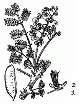 云实属攀援灌木。树皮暗红色,密生倒钩刺。托叶阔,半边箭头状,早落;二回羽状复叶,长20-30cm,羽片3-10对,对生,有柄,基部有刺1对,每羽片有小叶7-15对,膜质,长圆形,长10-25mm,宽6-10mm,先端圆,微缺,基部钝,两面均被短柔毛,有时毛脱落。总状花序顶生,长15-30cm;总花梗多刺;花左右对称,花梗长2-4cm,劲直,萼下具关节,花易脱落;萼片5,长圆形,被短柔毛;花瓣5,黄色,盛开时反卷;雄蕊10,分离,花丝中部以下密生茸毛;子房上位,无毛。荚果近木质,短舌状,偏斜,长6-12cm,宽2-3cm,稍膨胀,先端具尖喙,沿腹缝线膨大成狭翅,成熟时沿腹缝开裂,无毛,栗褐色,有光泽;种子6-9颗,长圆形,褐色。花、果期4-10月。 |
