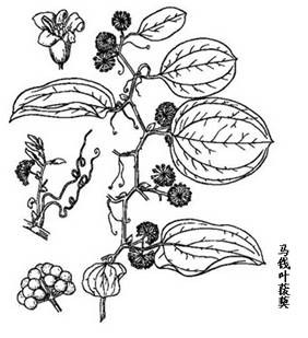 马钱叶菝葜攀援灌木,茎与枝条具纵条纹或棱,通常疏生刺。叶互生;叶柄长2-3cm,无鞘或鞘很狭,通常在中部有卷须,脱落点位于上部;叶片厚革质,椭圆形、卵状椭圆形至圆形,长5-11cm,宽3-9cm,先端通常微凸,有时近渐尖,基部近圆形;主脉3条在上面凹陷。伞形花序2-4个排成短圆锥花序;总花梗长3-10mm,花序托稍膨大,近球形;花单性,雌雄异株;花被片6,黄色;雄花外花被片长约6mm,宽约2mm,内花被片宽约1mm,雄蕊6,长3-6mm;雌花比雄花小,具3枚退化雄蕊,子房3室,柱头3裂。浆果球形,直径5-6mm,熟时黑色。花期3-4月,果期8-10月。