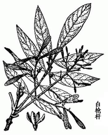白枪杆属落叶乔木,高约10m。树皮灰白色。芽裸露,密被锈色糠秕状毛和短茸毛。幼枝稍扁,近四棱形,密被褐色茸毛,小枝灰褐色,具纵棱,疏被柔毛和短茸毛,稀疏散生。叶轴上面具窄沟,均密被棕色茸毛;小叶9-15枚,革质,椭圆形至披针状椭圆形,长3-8cm,宽1.5-4cm,先端急尖或钝,基部楔形至阔楔形,叶缘略反卷,上面密被棕色茸毛,下面密被白色柔毛和黄色绒毛,脉上与叶缘尤密,小叶近无柄。圆锥花序生于当年生枝端或上部叶腋;苞片线形,长2-3mm;花梗细,长约3mm,与苞片均密被黄色茸毛;花萼杯状,长约1mm,先端截平或浅裂而成阔三角形,微被毛;花冠白色,裂片线形,长约3mm;两性花具雄蕊2,伸出药冠之外;雌蕊长约2.5mm,柱状棍棒状,2浅裂。翅果匙形,翅甚扁平,下延至坚果中部以下。花期6月,果期9-10月。 |