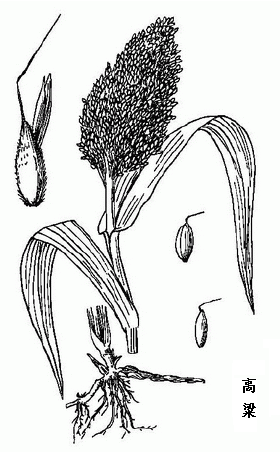 高粱属一年生栽培作物。秆高随栽培条件及品种而异,节上通常无白毛髯毛。叶鞘无毛或被白粉;叶舌硬纸质,先端圆,边缘有纤毛;叶片狭长披针形,长达50cm,宽约4cm。圆锥花序有轮生、互生或对生的分枝;无柄小穗卵状椭圆形,长5-6mm,颖片成熟时下部硬革质,光滑无毛,上部及边缘具短柔毛,两性,有柄小穗雄性或中性;穗轴节间及小穗柄为线形,边缘均具纤毛,但无纵沟;第1颖背部突起或扁平,成熟时变硬而光亮,有窄狭内卷的边缘,向先端渐内摺,第2颖舟形,有脊;第1外稃透明膜质,第2外稃长圆形或线形,先端2裂,从裂齿间伸出芒,或全缘而无芒。颖果倒卵形,成熟后露出颖外,花、果期秋季。