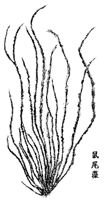 3. 鼠尾藻的藻体暗褐色,高10-50cm,可达120cm。固着器为扁平的圆盘状,边缘有裂缝,上生有一条主干。主干短,圆柱形,有鳞状的叶痕。主干顶端长出数条初生枝。幼期鳞片状小叶密密地排列在主干上,很象一个小松球。初生枝的幼期也覆盖以密螺旋状重叠的鳞片叶,次生枝短,枝上有纵沟纹。叶丝状,披针形,边缘全缘或有粗锯齿。气囊小,窄纺锤形或倒卵圆形,有囊柄。生殖托为长椭圆或圆柱状,先端钝,生于叶腋间。