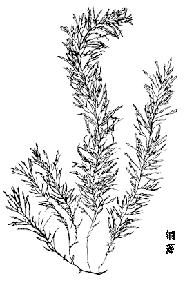 4. 铜藻的藻体黄褐色,高0.5-2m,可达8m,体质较为纤弱。固着器裂瓣状,上生圆柱形的主干。主干一般为单生,径1.5-3mm,幼期生刺状突起,渐长则除基部和枝的下部保留刺外,中上部均变为平滑。幼体的叶连接主干处向下生有纵走的浅沟,这种浅沟在枝上也常出现,藻体长大后,主干上仍保留有基部叶的痕迹,但侧枝与主干的区分不如幼时易于辨别。体下部的叶有不甚明显的反曲现象,叶基部的边缘常向中肋处深裂,向上主叶尖则逐渐浅裂并变狭窄,叶尖微钝;叶片长1.5-7cm,宽0.3-1.2cm,有中肋,主叶尖处则渐消失。柄部细长,多在1-2cm间。气囊圆柱状,长0.5-1.5cm,宽0.2-0.3cm,两端尖细。顶端冠一小裂叶。生殖托圆柱状,两端较细,顶生或生在叶腋;一般雄托长4-8cm,径1.5-2mm;雌托长1.5-3cm,径2.0-3.0mm,均具短柄,卵在排出之际,托径变粗,常自下向上作二三次分段成熟。