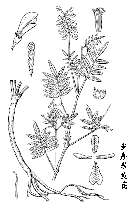 多序岩黄芪为多年生草本,高达1.5m。主根粗长,圆柱形,外皮红棕色,长10-50cm。叶互生;叶柄长;托叶披针形,基部连合;奇数羽状复叶,长达15cm;小叶7-25,叶柄基部甚短;叶片长圆状卵形,长1-3.5cm,宽5-11mm,先端近平截或微凹,基部宽楔形,全缘,上面无毛,下面中脉被长柔毛。总状花序腋生,长5-8cm,有花20-25,花梗丝状,长2-3mm,被长柔毛;花萼斜钟形,被短毛,最下面1个萼齿较其余4齿长大;蝶形花冠,淡黄色,长约1cm;雄蕊1091离,子房狭长形,具柄。荚果扁平,串珠状,有3-5节,边缘具窄翅,表面有稀疏网纹及短柔毛,每节有椭圆形种子1颗。花期6-8月,果期7-9月。