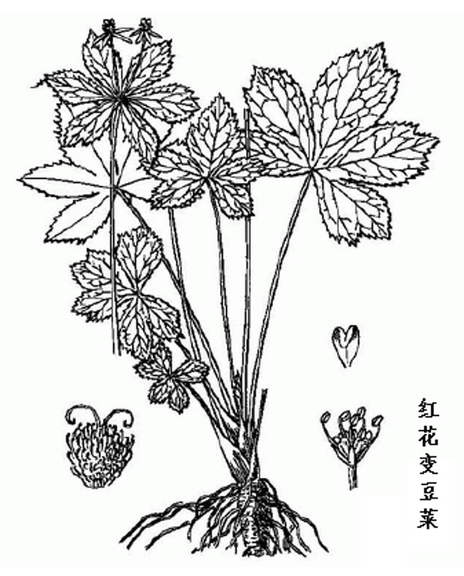 红花变豆菜属多年生草本,高40-100cm。根茎短,有许多细长须根。茎直立,单一,花葶状,下部不分枝。基生叶多数;叶柄长13-55cm;叶片圆心形或肾圆形,长3.5-10cm,宽6.5-20cm,掌状3全裂,侧裂片宽倒卵形,2深裂,各裂片顶端常具不等的2-3浅裂,边缘有尖齿或芒状齿。总苞片2,叶状,无柄,每片3深裂,裂片倒卵形至倒披针形,长3.5-9cm,宽1.5-4.5cm,边缘有锯齿。伞形花序3出,小总苞片3-7,倒披针形或宽线形,长0.7-3.5cm,宽3-6mm;小伞形花序多花,雄花15-20,萼齿卵状披针形,顶端渐尖,中间有1脉;花瓣淡红色至紫红色,先端内凹;两性花3-5,萼齿、花瓣与雄花同色;花柱长于萼齿2倍,向外反曲。果实卵形或卵圆形,长约4.5mm,宽4mm,基部有瘤状突起,上部有淡黄色或金黄色的钩状皮刺,分生果横剖面卵形,有油管5。花、果期6-9月。