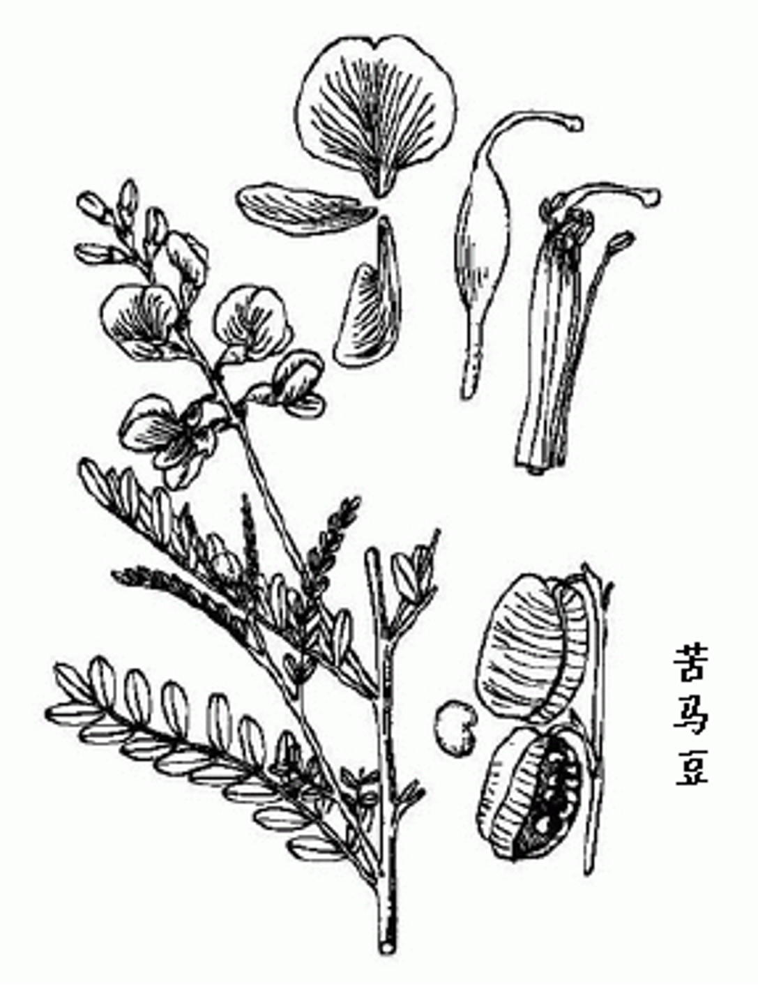 苦马豆属矮小灌木,高20-100cm。全株疏生短伏毛。奇数羽状复叶,互生;小叶13-21,小叶片倒卵状椭圆形或长椭圆形,长5-15mm,宽3-6mm,先端钝圆或微凹,基部宽楔形,上面无毛,背面有白色伏毛;小叶柄极短;托叶披针形。总状花序腋生,花4-9,疏生,淡红色,长约12mm;萼杯状,5齿,被白毛;旗瓣圆形,先端凹,基部有爪,两侧外卷,翼瓣顶尖,具耳,龙骨瓣长于翼瓣;雄蕊10,二体;子房具柄,有柔毛。荚果膜质,黄白色,长圆形,有长柄,表面光滑。种子肾状圆形,褐色。花期4-5月,果期7-8月。