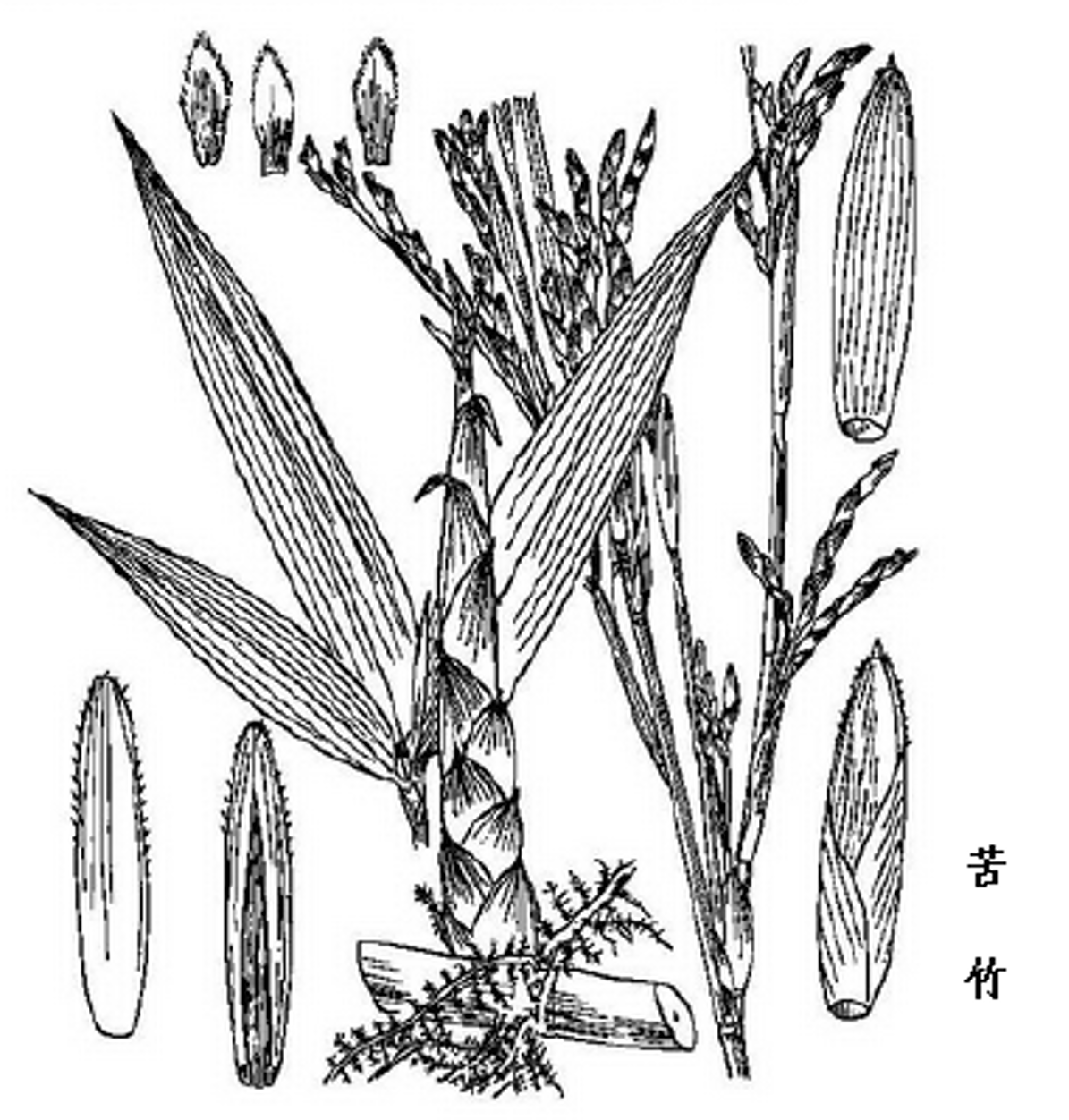 苦竹属植株呈小乔木或灌木状。竿直立,高3-5m,粗1.5-2cm,竿壁厚约6mm。幼竿淡绿色,具白粉,老时绿黄色,被灰白色粉斑;竿散生或丛生,圆筒形,竿环很隆起;每节有3-7分枝,但在每分枝一侧的节间下部1/4处稍平,鞘环有1圈褐色箨鞘基部残留物,箨鞘厚纸质和革质,绿色,无或有细小的紫色斑点,有棕色或白色小刺毛,基部与竿相连处较密,内面光滑而有光泽,边缘密被金黄色的纤毛;箨耳很小,深褐色,有直立棕色毛;箨舌截平,长1-2mm,边缘密生纤毛;箨叶细长披针形,幼时绿色,多脉,无显着的中脉;叶鞘无毛,有横脉;叶舌质坚硬,截平,长0.5-2mm:叶片披针形,长8-20cm,宽5-28cm,质坚韧,表面深绿色,背面淡绿色,有微毛,尤以基部为甚;叶柄长2-7mm。花枝基部有苞片,花序分技与小穗柄略扁平,常呈波状曲折,小穗绿色,小穗有8-12小花,长4-6cm,绿色或淡紫色,小穗轴间长4-5mm,在杯状顶端有纤毛;颖3-5,有锐尖头,边缘有纤毛;外稃披外形,近革质,有横脉,边缘粗糙,内稃背部2脊间有沟纹,鳞被3,后方1片长于前方2片;雄蕊3,有细长而互相分离的花丝,花药黄色,药隔不伸出;花柱1,柱头3,羽毛状。颖果长圆形。花期4-5月。