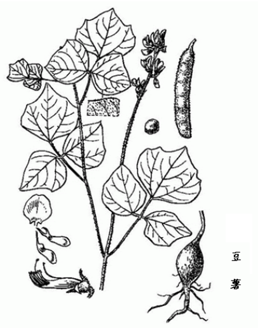 豆薯属一年生草质藤本。块根肉质肥大,圆锥形或纺锤形,肉白色,味甜多汁。茎缠绕状,长5-6m。三出复叶,互生;叶柄长7-8cm;顶端小叶菱形,长5-7cm,或更长可达16cm,宽5.5-18cm,两侧小叶卵形或菱形,长3.5cm-14cm,宽3-14cm,先端锐尖,上部呈数浅裂,中部以下全缘,基部阔楔形,两面均有毛。总状花序生于枝端,花序梗长20-30cm,有花约10朵;苞片小,卵形;花萼钟形,绿色有毛,先端5裂,裂片披针形,蝶形花冠蓝紫色或淡紫红色,旗瓣近圆形,先端微凹,基部两侧有耳,翼瓣稍呈倒卵形,基部有两爪,龙骨瓣分离;雄蕊10,二体;子房长柱形而扁,有毛,花柱内弯,柱头圆形。荚果扁平,长约9cm,表面有绒毛,褐色,开裂;种子5-10颗,近方形而扁,长约8mm,棕褐色,平滑,有光泽。花期7-9月,果期10-11月。