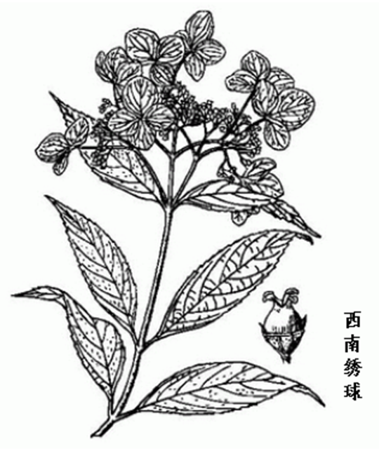 西南绣球属落叶灌木,高达2m。小枝幼时有细毛,较老时呈淡褐色。叶对生,薄纸质;叶柄长1-2.5cm,被柔毛;叶片椭圆状披针形至长圆状披针形,长8-15cm,先端长渐尖,基部楔形,边缘具齿状锯齿,上面黄绿色,近无毛,下面沿叶脉有细毛。伞房花序,疏松,径12-25cm,有时成圆锥状,通常无总花梗,着生于顶生叶腋间,有数对稍疏离的分枝,被柔毛,花序基部有1-2对叶;花二型,不育花径2.5-4cm,萼片3-4枚,卵圆形,全缘,长约1-1.5cm;孕性花带蓝色,花萼4-5裂,裂片披针形;花瓣5,分离开张;雄蕊10;子房半下位,花柱3-4枚。蒴果近球形,直径约2.5mm,在中部处有托萼片,先端孔裂,有3枚宿存花柱。种子无翅。花期6-7月,果期8-9月。