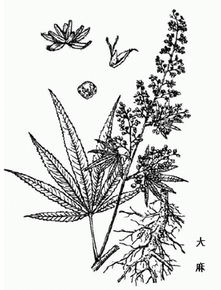 化合物成分:大麻碱(cannabisativine),脱水大麻碱(anhyrocannabisativine),胆碱(choline),神经碱(neurine),无羁萜(friedelin),表无羁萜醇(epifriedelinol),葛缕酮(carvone),二氢葛缕酮(dihydrocarvone),β-谷甾醇(β-sitosterol),大麻环醚萜酚(cannabiglendol),5α-麦角甾-3-酮(5α-ergostan-3-one),5α-豆甾-3-酮(5α-stigmastan-3-one),菜油甾醇(campesteol),豆甾醇(stigmasterol),5β-豆甾-22-烯-3-酮(5β-stigmast-22-en-3-one),豆甾-4-烯-3-酮(stigmast-4-en-3-one),菜油甾-4-烯-3-酮(campest-4-en-3-one),豆甾-4,22-二烯-3-酮(stigmast-4,22-dien-3-one),豆甾-5-烯-3β-醇-7-酮(stigmast-5-en-3β-ol-7-one),菜油甾-5-烯-3β-醇-7-酮(campest-5-en-3β-ol-7-one)等。