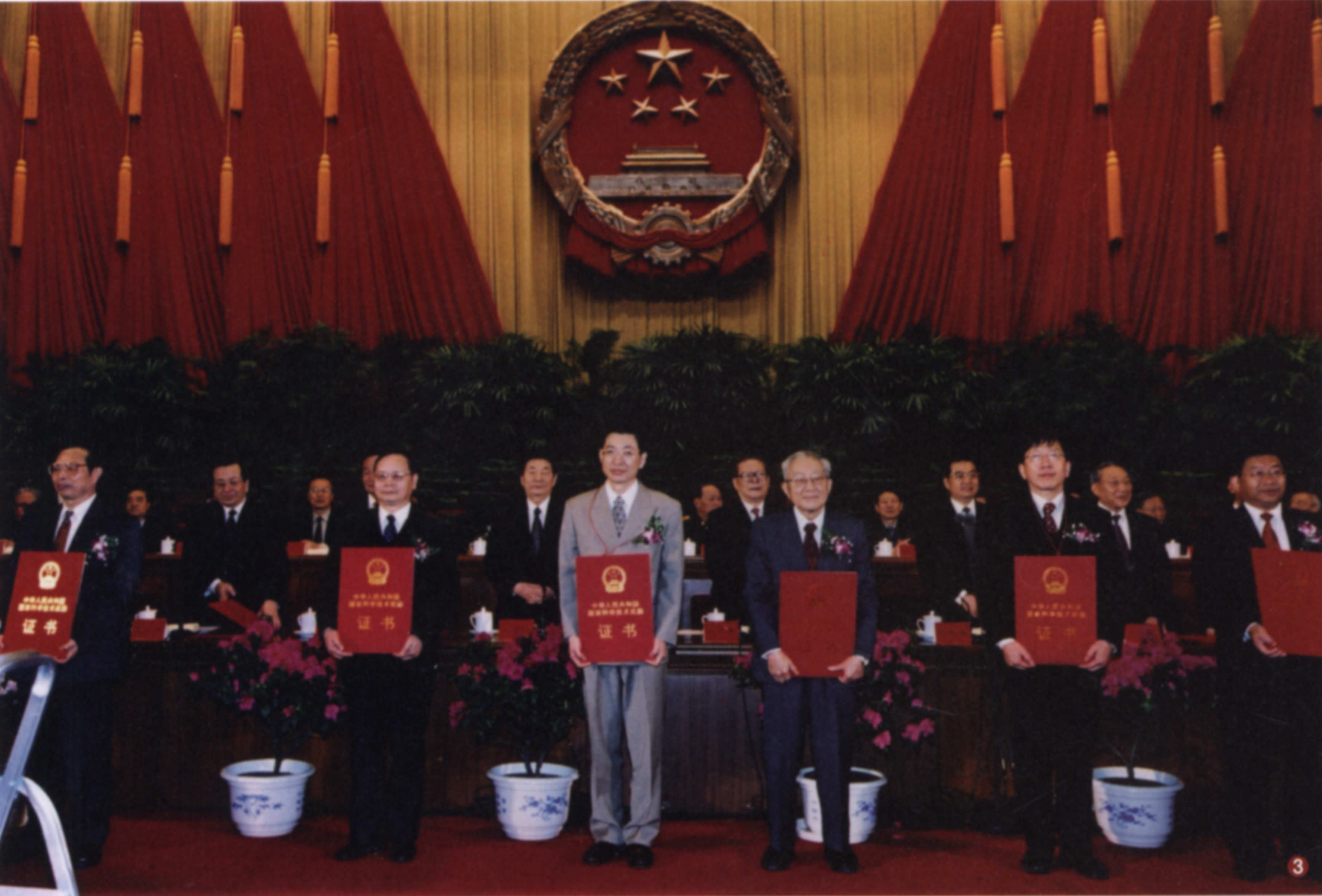 蒋锡夔(前排右3)作为第一完成人获2002年国家自然科学奖一等奖。图为颁奖大会上
