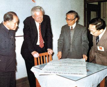 1985年诺贝尔奖获得者D.H.R.巴顿教授(左2)访问上海有机化学研究所时,周维善(右2)向他介绍工作。左1为汪猷、右1为戴立信