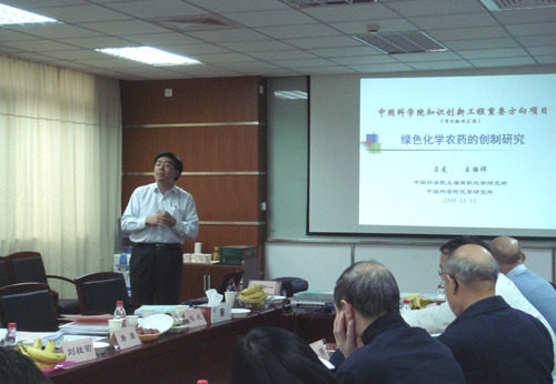 2009年11月15日,中国科学院高技术研究与发展局组织专家在上海对中国科学院知识创新工程重要方向项目“绿色化学农药的创制研究”召开了验收会。中国科学院高技术研究与发展局刘桂菊副局长、材料化工处曹红梅处长、唐清副处长出席了验收会。