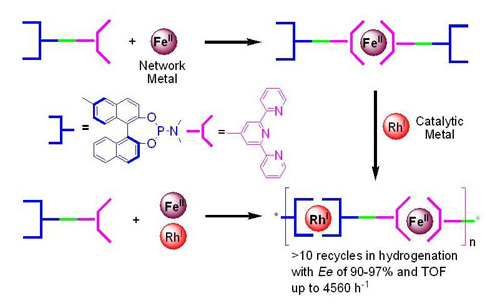 最近课题组研究人员在上述工作基础上,采用同时含三联吡啶(tpy)和手性单磷配体MonoPhos结构单元的桥联配体,巧妙地通过与亚铁盐和铑盐选择性自组装, 得到一系列含双金属Fe(II)、Rh(I)的手性配位聚合物催化剂。这类催化剂可以高效地催化α-脱氢氨基酸衍生物、苯基烯胺和衣康酸二甲酯的非均相不对称氢化反应(TOF>4500h-1),以定量的底物转化和优秀的对映选择性(90-97% ee)获得相应的氢化产物,催化剂可以方便地回收和循环使用十次以上,而效率和选择性没有明显下降。上述结果展示了一种新的高效、简便的手性催化剂负载化新模式,研究结果发表在Angew. Chem. Int. Ed. 2010, 49, 3627-3630上。