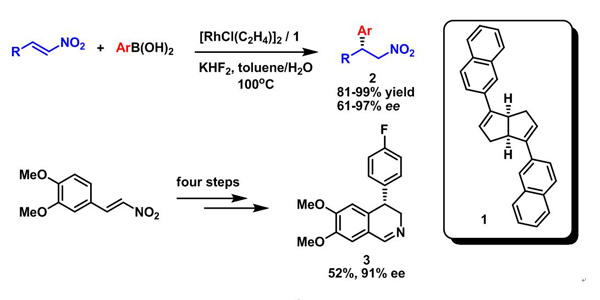 最近该课题组研究人员在上述工作基础上,成功实现了铑催化的芳基硼酸对于硝基烯烃的不对称加成。作为重要的手性合成砌块,手性硝基化合物的合成研究一直受到重视。但是原有以手性膦配体为代表的杂原子手性配体金属络合物对于催化此类反应,仅有有限的底物报道,且选择性通常不高。采用手性二烯配体/铑络合物(1)为催化剂,可以高产率和高选择地合成一类手性硝基化合物2。上述加成产物通过几步简单合成,就可以得到具有潜在生物活性的手性异喹啉类化合物如3。该研究结果发表在Angew. Chem. Int. Ed. 2010, 49, 5780-5783上。同时手性二烯/钯催化的不对称Suzuki交叉偶联反应也有突破,相应工作已被Org. Lett.接收,DOI: 10.1021/ol102521q。