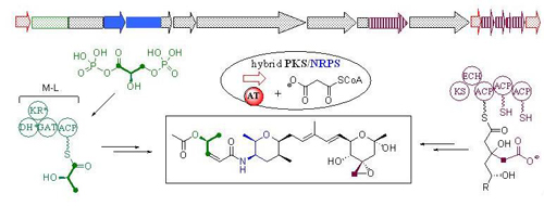 上海有机所生命有机化学国家重点实验室的科研人员经过三年多的努力,采用PCR克隆特异的羟基-甲基戊二酰辅酶A合成酶(HCS)基因的方法从假单孢菌sp. No. 2663中克隆了完整的FR901464生物合成基因簇。该基因簇包含20个基因,编码5个“AT-less”聚酮合成酶(PKS),1个杂合的聚酮/非核糖体聚肽合成酶(PKS/NRPS),1个非核糖体聚肽合成酶(NRPS),3个独立的酰基转移酶(AT),4个聚酮骨架β-烷基化相关蛋白,4个后修饰酶,2个调控蛋白。通过体内基因敲除和体外生化实验相结合,初步阐明了FR901464独特的生物合成途径:采用高度杂合的“AT-less”PKS-NRPS-HCS三元体系,以甘油作为PKS的起始单元、Baeyer-Villiger氧化解离聚酮链。该研究揭示了自然界聚酮天然产物生物合成中复杂多样的生物合成机理,为进一步发现新的酶催化反应、并通过对其生物合成基因的调控产生结构类似物创造了条件。