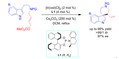 2010年,上海有机所金属有机化学国家重点实验室的科研人员发现金属铱催化的吲哚不对称烯丙基去芳构化反应。在[Ir(cod)Cl]2和该小组发展的四氢喹啉骨架配体(L1)的催化体系中,3-位取代的吲哚可以发生直接的分子内不对称烯丙基去芳构化反应,高收率、高立体选择性地得到吲哚去芳构化产物(Q.-F. Wu, H. He, W.-B. Liu, S.-L. You, J. Am. Chem. Soc. 2010, 132, 11418-11419.)。作为金属铱催化的直接烯丙基去芳构化反应的首例报道,该方法提供了一条原料简单易得且最为直接的合成Spiroindolenine骨架的方法。该类化合物骨架在天然产物和药物活性分子中广泛存在。同时,该反应体系中实现的去芳构化反应为金属铱催化的烯丙基化反应提供了新的反应模式。
