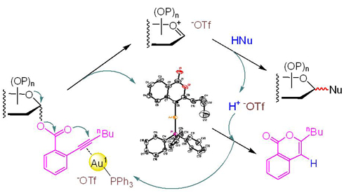 近来,上海有机所生命有机化学国家重点实验室俞飚课题组发展了新一代的糖苷化反应:以糖基邻炔基苯甲酸酯为给体的一价金催化的糖苷化反应。使用该反应他们完成了一系列活性寡糖和糖缀合物的高效合成,如四糖抗生素TMG-chitotrimycin(J. Am. Chem. Soc., 2009, 131, 12076-12077)。