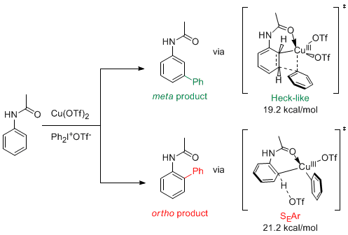 亲电芳香取代 (SEAr) 是人们广泛研究的重要反应之一。大家熟知的傅克反应的定位规律是:给电子基团将亲电试剂导向邻位或对位,并提高反应活性;而吸电子基团将亲电试剂导向间位,并降低反应活性。酰基苯胺中的酰胺基 (N端取代,RCONH-) 是传统意义上的邻对位定位基,发生亲电取代反应时只会生成邻位或对位产物。然而,2009年,剑桥大学的Gaunt教授利用Cu(II)催化剂,二芳基高价碘化合物作为芳基化试剂,实现了酰基苯胺间位C-H键的芳基化(Science 2009, 323, 1593)。