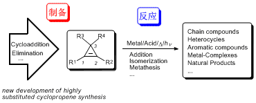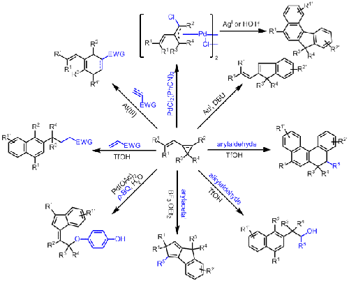 金属有机化学国家重点实验室的施敏课题组长期从事于高张力分子的反应研究,对于一类环丙烯化合物的开环串联反应进行了系统的研究,通过各种催化剂可以合成各种结构新颖的化合物(图2)。工作可见:Org. Lett. 2007, 9, 117-120; Chem. Eur. J. 2008, 14, 10219-10222; Chem. Commun. 2009, 1392-1394; Chem. Eur. J. 2009, 15, 7543-7548;Org. Lett. 2009, 11,5278-5281; Org. Lett. 2010, 12,4462-4465; Organometallics 2011, 30, 627-632.