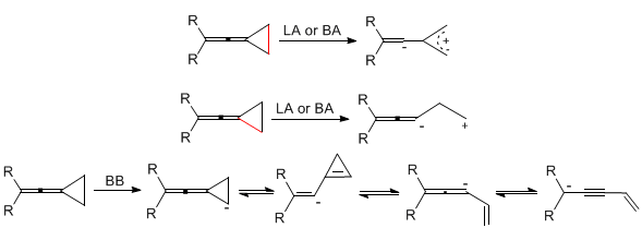 并且在2010年的Chem. Rev. 2010, 110, 5883-5913中如图3所示对于亚乙烯基环丙烷张力分子的反应新模式进行了总结。在Lewis酸(LA)和质子酸(BA)的作用下,其近端或者远端的碳-碳键可以发生断裂进行串联反应,以远端的碳-碳键发生断裂为主。在LDA或者nBuLi等Br?nsted碱(BB)作用下,能够产生各种类型的碳负离子和各种亲电试剂进行选择性的串联反应。