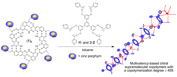 上海有机化学研究所物理有机化学研究室和生命有机化学国家重点实验室的研究人员与北京大学的科研人员合作,模拟自然界自组装构建结构多样的生物大分子如DNA等的原理,利用超分子作用多价性的策略来构筑了一类高度稳定的手性超分子聚合物。其构建首先通过末端引入卟啉单元的DDA-AAD(D-氢键给体,A-氢键受体)型多重氢键砌块1在低极性溶剂中通过分子间氢键六聚形成盘状结构,这一氢键稳定的盘状结构进一步利用其外围伸展的六个锌卟啉单元与手性配体R-2(或S-2)中的吡啶通过N-Zn配位作用形成高度稳定的层状手性超分子聚合物,其组装过程的立体选择性来源于R-2(或S-2)中手性中心的诱导作用。研究还表明该超分子聚合物的形成过程中存在一个自纠错和从动力学控制到热力学控制转化的过程。该体系的驱动力来自于氢键和金属配位作用两种非共价作用,尽管单个非共价作用的强度并不大,但当多个非共价作用(该超分子聚合物的一个基本单元中存在十八个氢键和六个金属配位作用)加合协同作用时,就可产生很强的结合能力,不但实现了高度稳定超分子聚合物的制备,还保证了利用组装基元内在的手性中心来诱导出聚合物层次上立体选择性的有效性。这一策略展示了利用超分子化学的多价性来进行多层次有序组装的巨大潜力。此外,由于卟啉是一种具有非常优异光电特性的大π共轭体系,所得到的超分子聚合物较高的聚合度也意味着单条聚合物链中有几千个卟啉单元在特定的手性环境中有序排列,这类聚合物有可能作为光吸收天线或在其他光电器件中得到一些应用。该工作以通讯的形式发表于《美国化学会志》(J. Am. Chem. Soc.2011, 133, 11124-11127)。