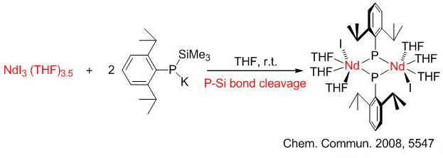 研究含过渡金属-磷键的配合物不仅对于化学键的理论发展有重要贡献,而且这类配合物在合成化学领域具有重要的实际应用。在过去几十年中,大量各种含过渡金属-磷键的配合物被合成,而含稀土-磷键的配合物却是例外。这是由于稀土金属离子是硬Lewis酸,而磷为软Lewis碱,按照Pearson的软硬酸碱(HSAB)原理,稀土-磷的成键是不匹配。2008年之前只有十余例稀土膦基配合物(含PR3或[PR2]-配体)的报道,没有稀土膦卡宾配合物(含[PR]2-配体)的报道,而稀土金属磷化物(含P3-配体)只以离子键无机固体形式(LnP)存在。