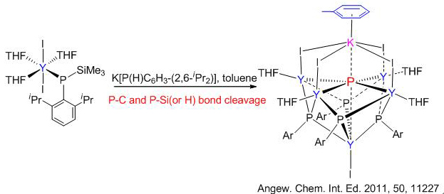 上海有机所金属有机国家重点实验室陈耀峰课题组开展了稀土-磷成键方面的工作,研究稀土金属离子和磷的成键模式。在2008年,该课题组和美国Los Alamos 国家实验室的Kiplinger课题组分别报道了一个轻稀土(Nd)(图 1)(Chem. Commun. 2008, 5547) 和一个重稀土(Lu)的桥联膦卡宾配合物。随后他们又合成了首个可溶性的稀土金属磷化物(图 2),并对其进行了溶液核磁和单晶X-射线衍射的表征 (Angew. Chem. Int. Ed. 2011, 50, 11227)。这方面工作是稀土金属与软Lewis碱类配体成键的一个突破,丰富了稀土金属配合物的结构体系和成键模式。