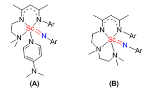 上海有机所金属有机国家重点实验室陈耀峰课题组利用该课题组发展的三齿氮配体,采用外加Lewis 碱(DMAP)促进烷烃消除的策略,首次成功合成并晶体结构表征了稀土金属末端氮宾配合物-钪末端氮宾配合物(图1, A),相关结果以封面文章的形式发表在Chem. Commun. (2010, 46, 4469)。进而又设计了一个四齿氮配体,利用增加的胺基作为分子内Lewis 碱,合成得到另一个新的钪末端氮宾配合物(图1, B) (Chem. Commun. 2011, 47, 743)。研究发现稀土金属钪末端氮宾配合物可以活化元素硒,和二氧化碳以及苯基氰、甲基丙烯酸甲酯、异氰酸等有机不饱和小分子发生[2+2]或者[2+4]环加成反应(Angew. Chem. Int. Ed. 2011, 59, 7677),活化三甲基硅基重氮烷烃的C-H键 (J. Am. Chem. Soc. 2013, 135, 8165),活化苯基硅烷的Si-H键(Organometallics, 2013, 32, 1137)以及和金属卤化物反应合成结构新颖的杂双金属配合物(Chem. Commun. 2012, 48, 3403)。这些工作首次揭示含特征稀土金属和主族元素氮双键的配合物是可以被稳定和合成的,也预示含稀土金属和其它主族元素(C,P等)双键的配合物合成的可能性,对钪末端氮宾配合物反应性能的研究也揭示稀土金属=氮双键丰富的反应化学。