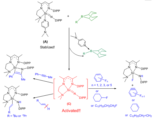 最近,该课题组利用Lewis 酸(硼烷)攫取钪末端氮宾配合物(A)中的DMAP,生成一个配位不饱和的钪末端氮宾配合物(C)。该配位不饱和的钪末端氮宾配合物在室温下就可以和内炔烃发生[2+2]环加成反应,活化末端烯烃的C-H键,对氟代苯和氟代烷烃进行脱氢和脱氟生成苯炔类化合物和烯烃(J. Am. Chem. Soc. 2014, 136, 10894)。对末端烯烃C-H键活化的机理研究揭示反应是经历直接的烯基C-H键活化而不是环加成氢转移机理。该工作不仅提供了活化Lewis碱稳定的稀土末端氮宾配合物的策略,该策略有望应用于激活其它Lewis碱稳定的稀土金属配合物,同时还进一步发展了稀土末端氮宾配合物的反应化学。