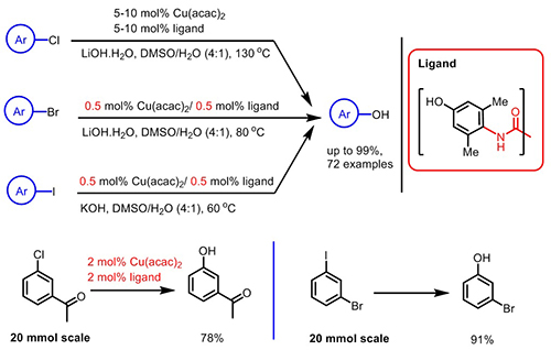 马大为研究团队成功地实现了铜催化的芳基氯代物的直接羟基化反应,对于活泼的芳基碘代物和溴代物该反应更可在很低的催化剂用量和温和的反应温度下进行,是对草酸酰胺配体应用的进一步发展。他们的新催化体系有望成为一个非常有竞争力的试剂,在苯酚和羟基杂芳基化合物合成中得到应用。