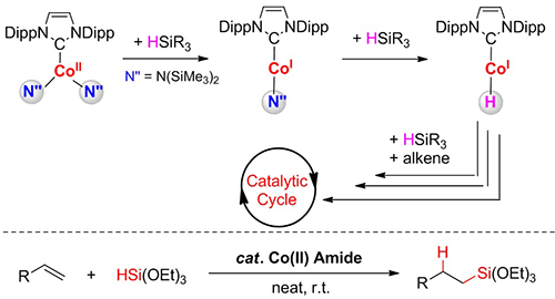 中国科学院上海有机所金属有机化学国家重点实验室邓亮课题组一直致力于低配位铁钴配合物促进共价键活化转化的研究。在硅烷的活化方面,他们曾利用低配位的钴-氮杂环卡宾配合物,探索了硅烷与低配位钴烷基化合物的反应,建立了钴(II)烷基化合物和钴(I)烷基化合物与硅烷的计量转化反应,创制了可催化烯烃与一级硅烷、炔烃与二级硅烷的氢硅化反应的钴配合物催化剂(Angew. Chem., Int. Ed. 2013, 52, 10845和J. Am. Chem. Soc. 2014, 136, 17414)。最近,该课题组又成功揭示了低配位钴胺基化合物与硅烷的反应模式,发现低配位的钴(II)胺基配合物与HSi(OEt)3反应可顺序生成低配位钴(I)胺基配合物和钴(I)氢配合物(图1),进而发展了可高效催化烯烃与三级硅烷发生硅氢化反应的钴(II)胺基配合物催化剂(J. Am. Chem. Soc. 2017, 139, 1798-1801)。该项工作深化了人们对相关无需额外活化剂的铁钴催化剂催化机制的认识,对新型廉价金属氢硅化反应催化剂的设计具有指导意义。